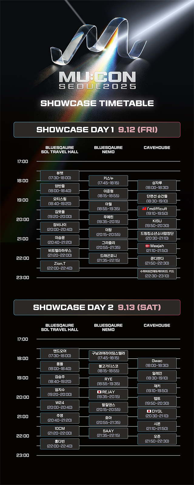 국내외 다양한 장르의 뮤지션들이 함께하는 뮤콘 쇼케이스! 이태원 일대 3곳의 공연장에서 펼쳐지는 무대에서 개성 넘치는 라이브 공연을 즐겨보세요.